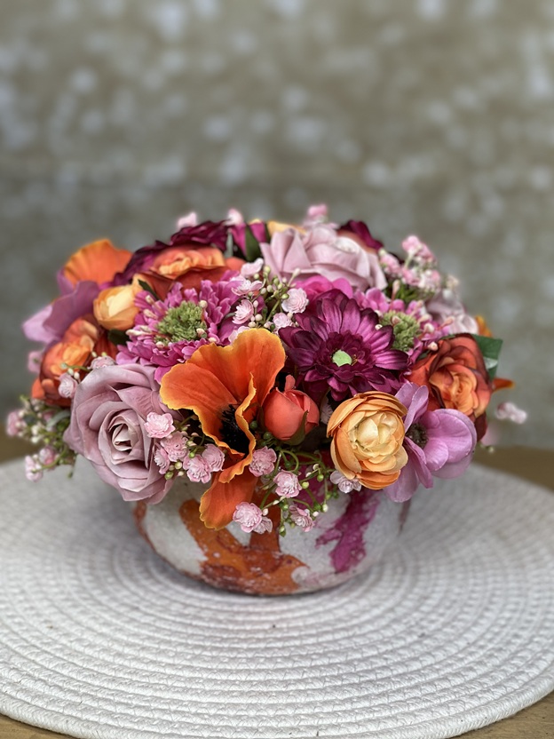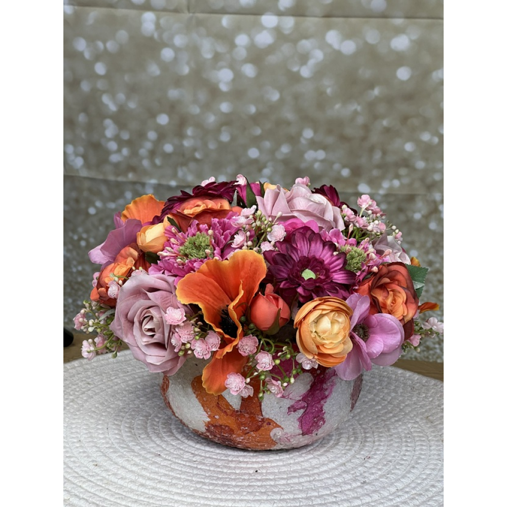 De zijden bloemen zijn gestoken in eeschaal van Diga Colmore .