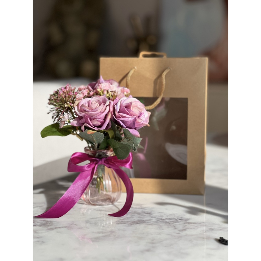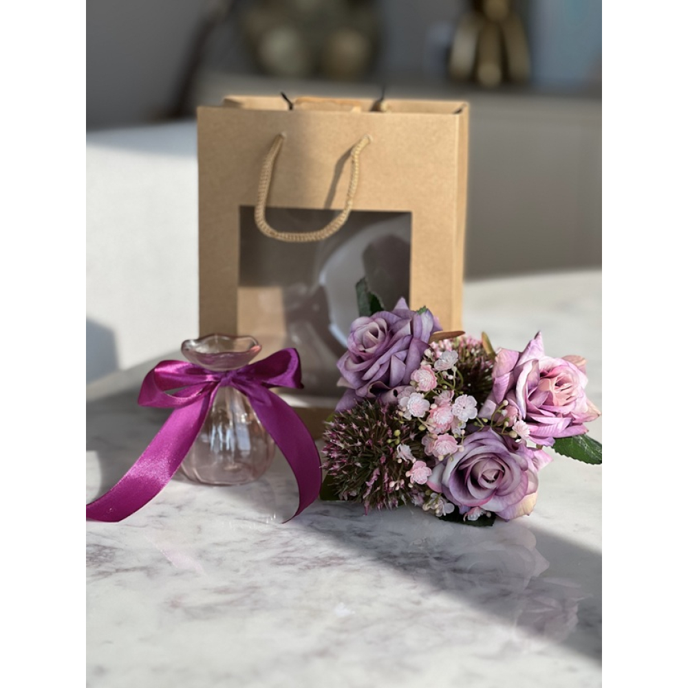 Gevuld met een zijden boeketje en een glazen vaasje.