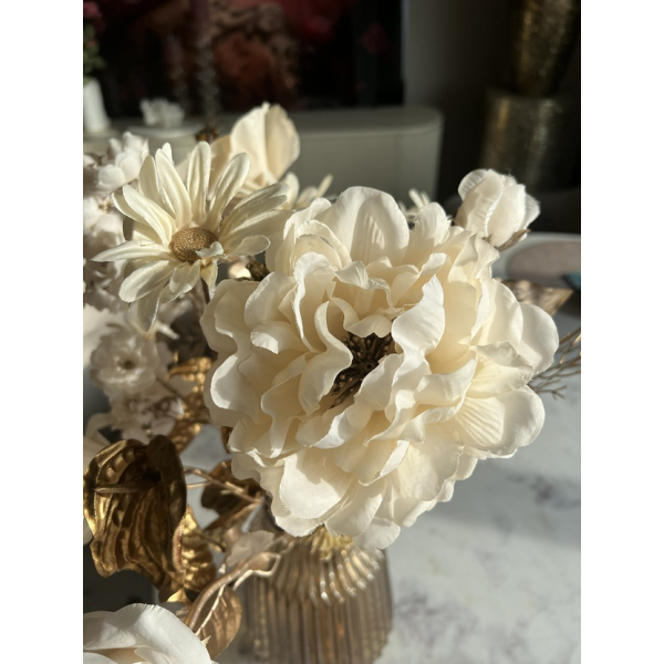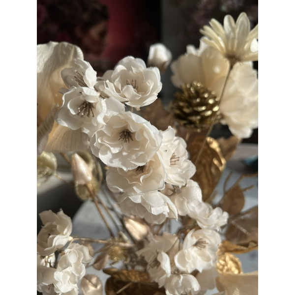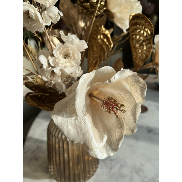 In het boeket zit: Daisys, Pioen Roos, Bloesem tak, Distels, Roos, Hibiscus, Anthurium blad.