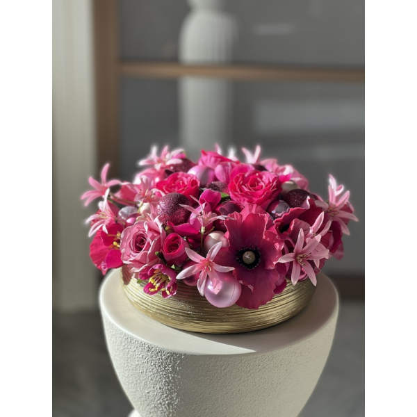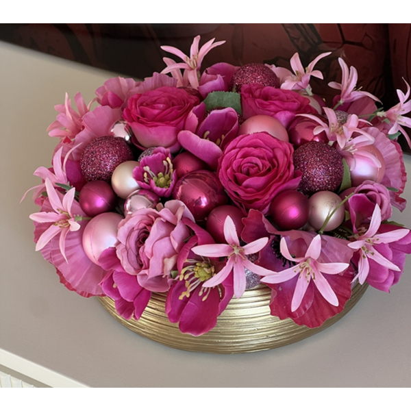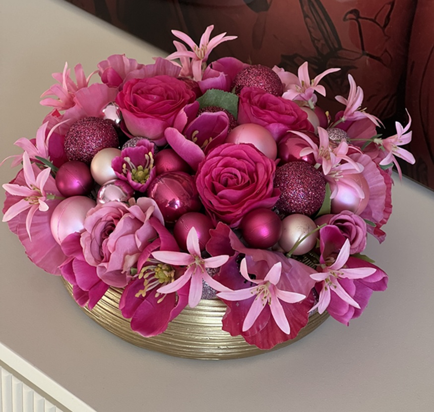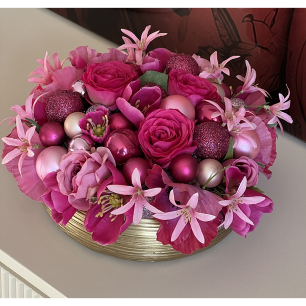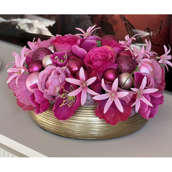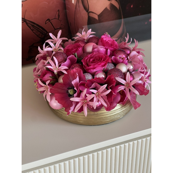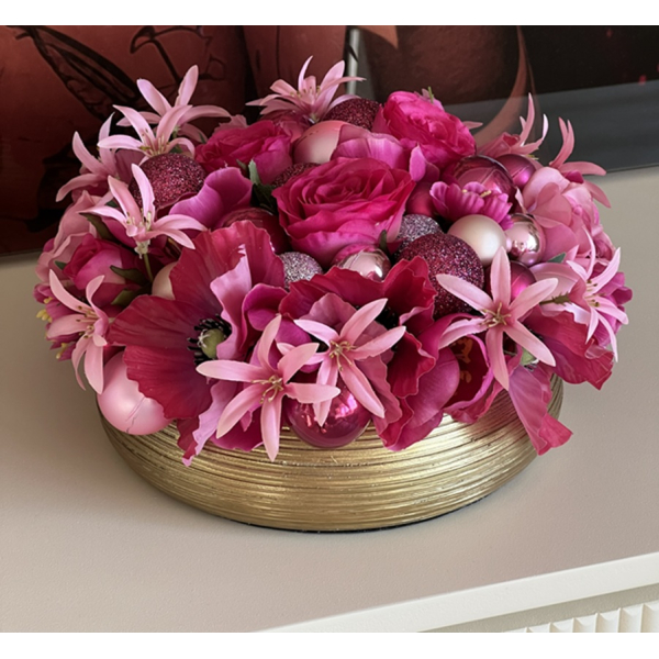De biedermeier is gemaakt in een metalen schaal van het merk Diga Colmore in goud kleur.