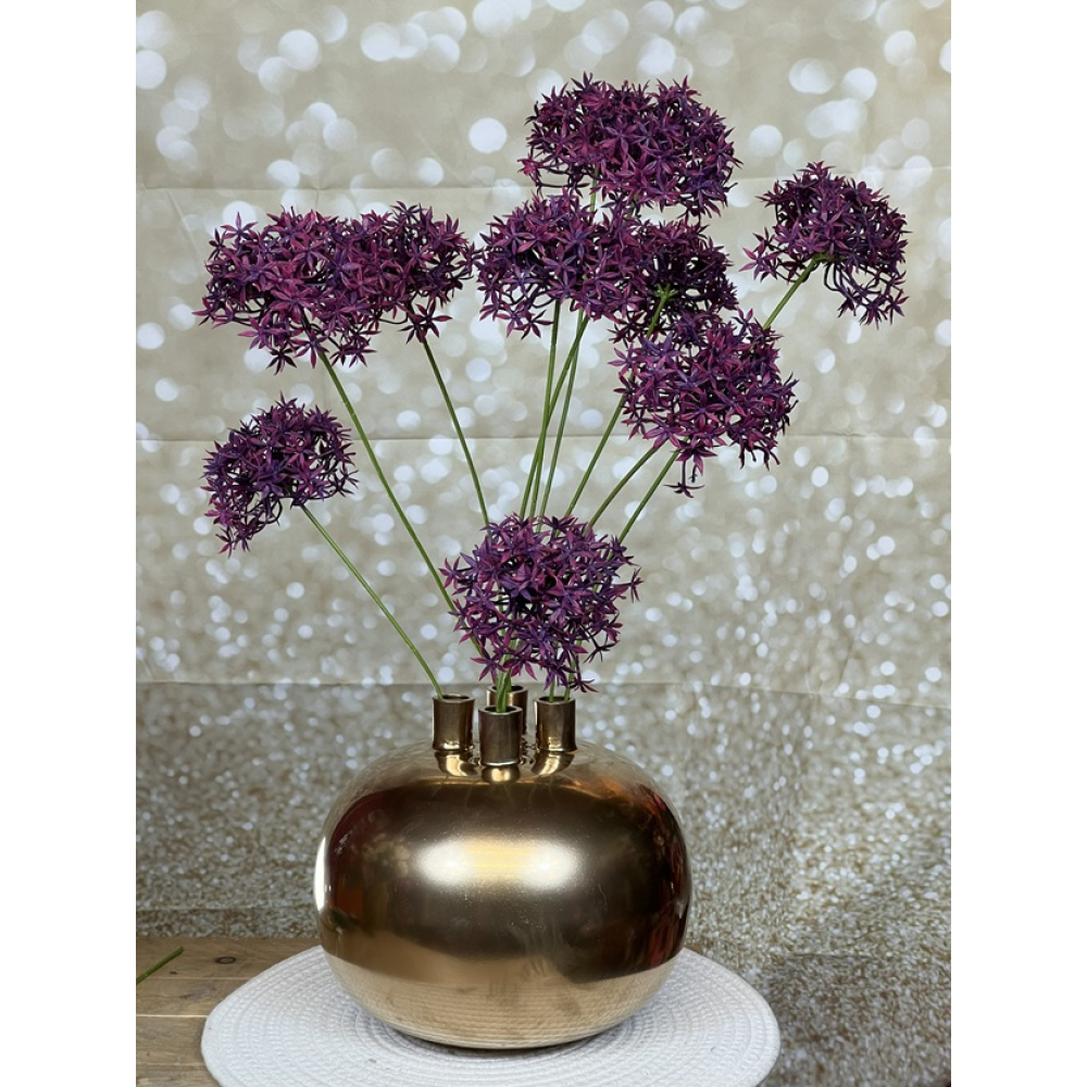 De metalen vaas is van het merk Vase the World. Deze is gevuld met bollen Allium van kunst. Hoogte ongeveer 65cm.