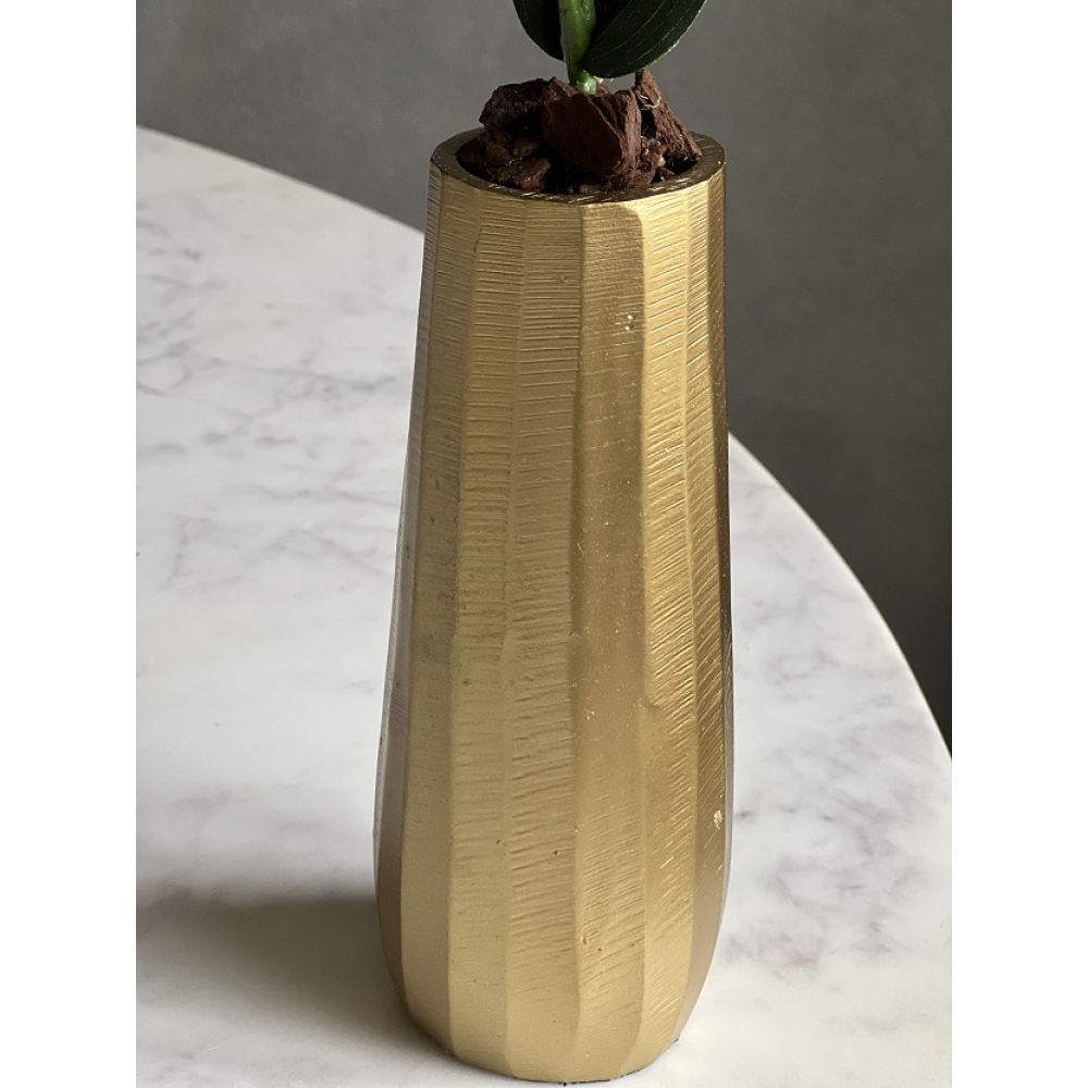 Opgemaakt in een goudkleurige metalen vaas van het mooie merk Diga Colmore.
