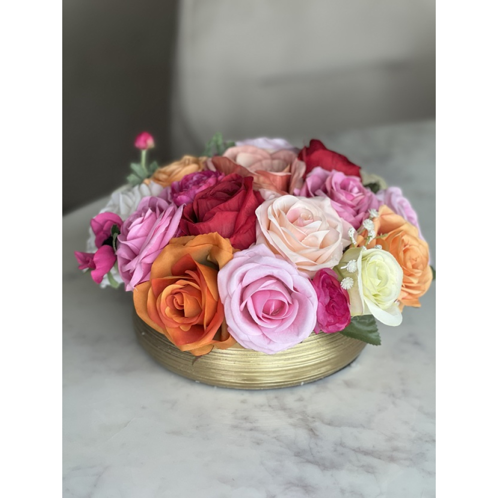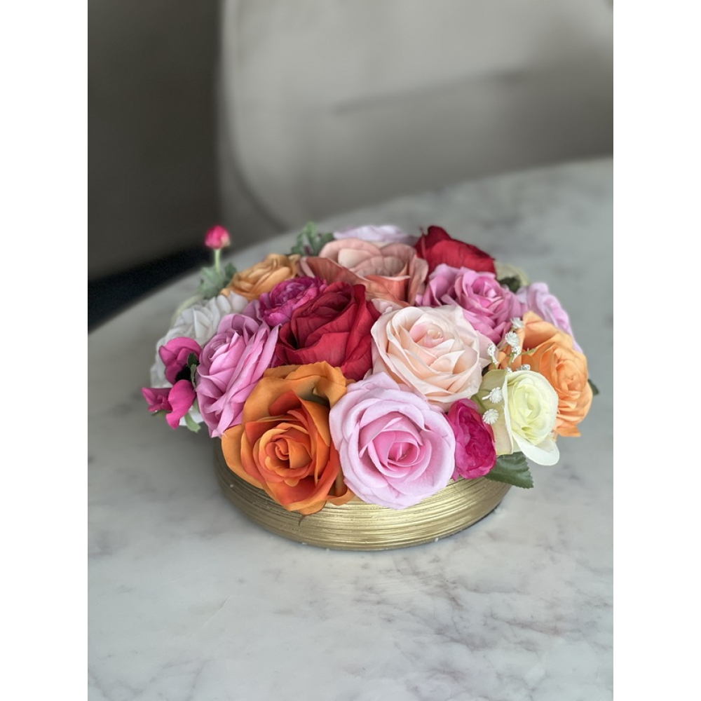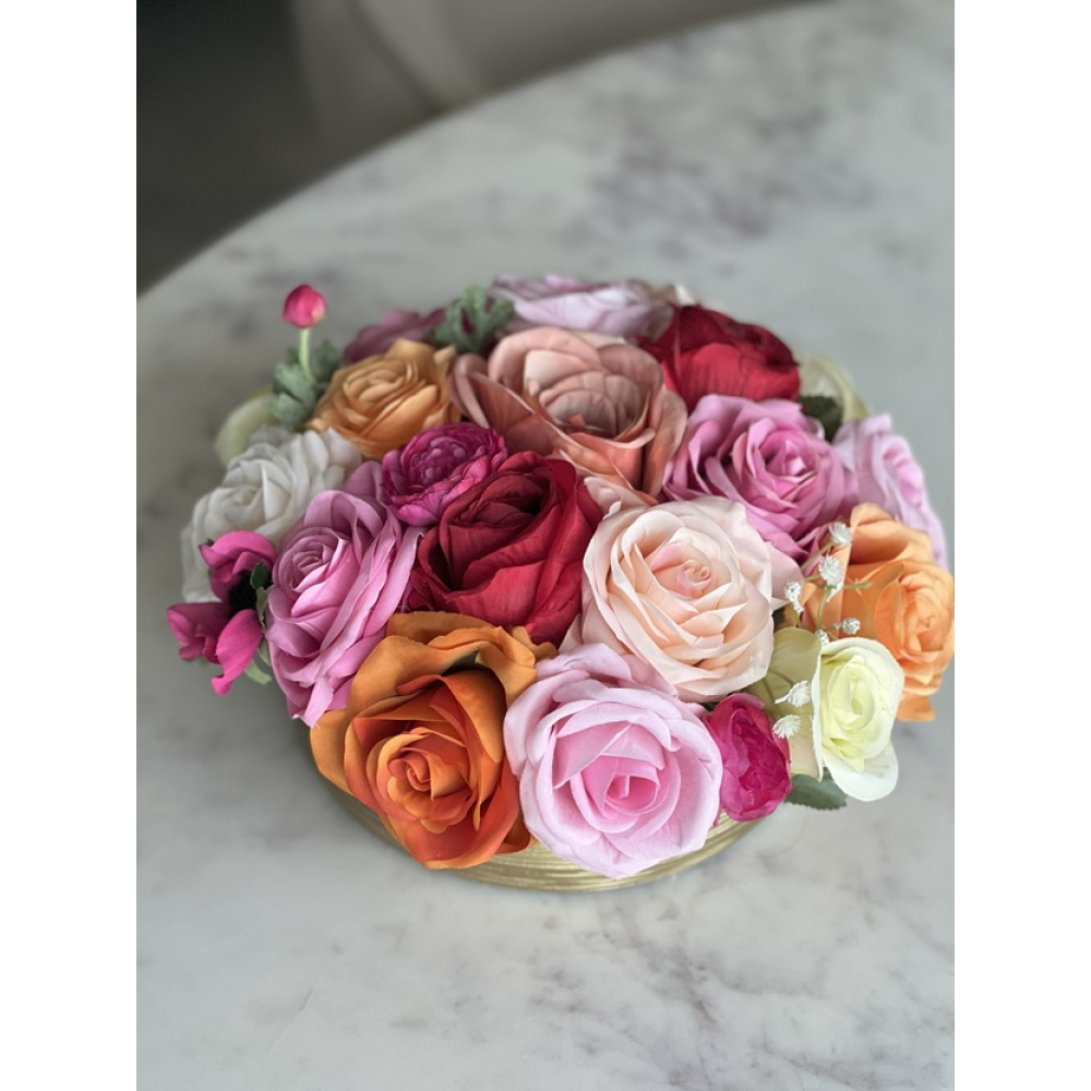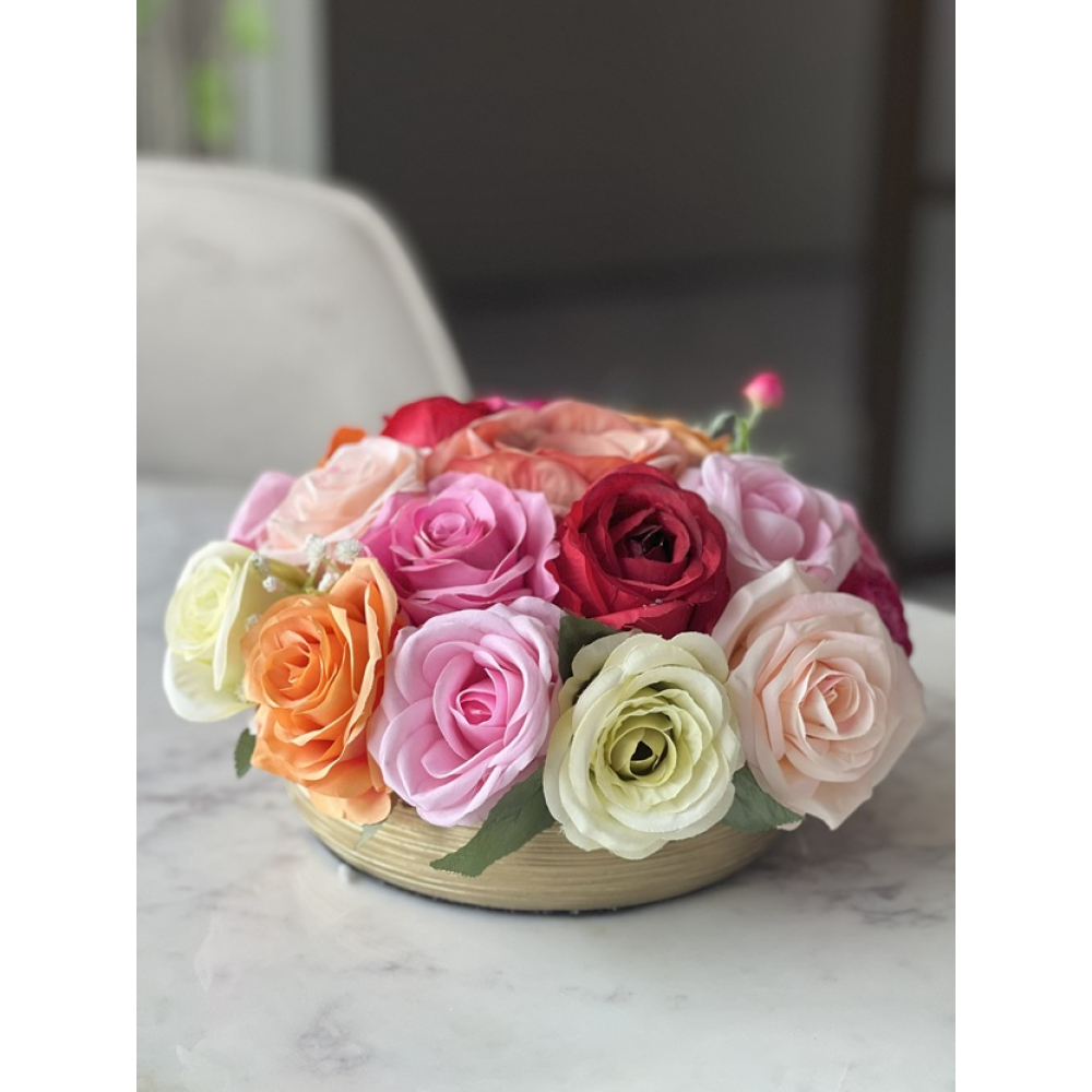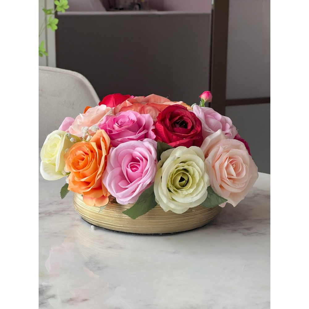 De schaal is opgemaakt met zijden rozen en wat ranonkeltjes.