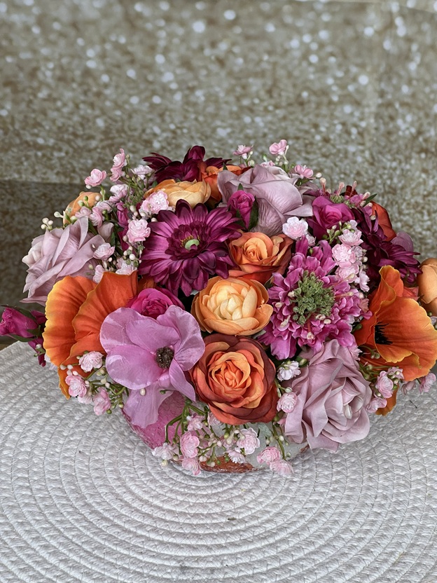 De bloemen zijn gestoken in speciaal steekschuim voor zijden bloemen.