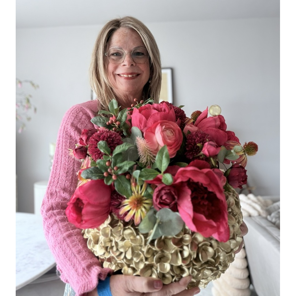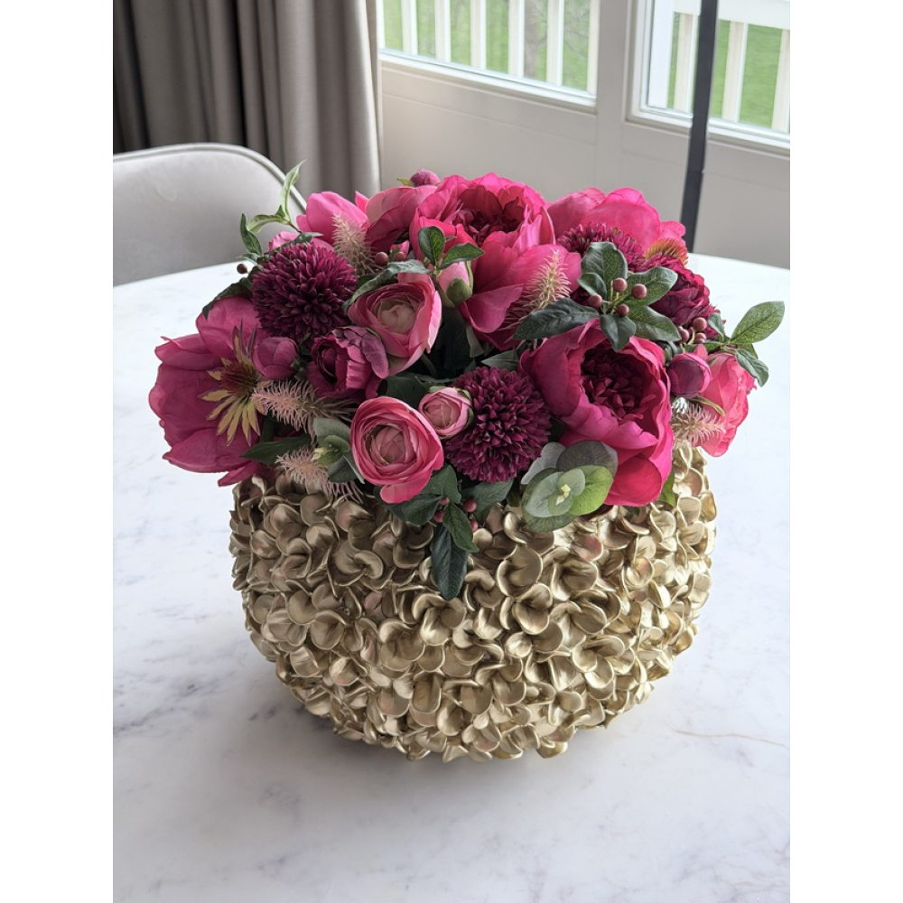 In het bloemstuk zit: Pioen Rozen, Ranonkels, Chrysanten bolletjes en verschillende groen soorten.