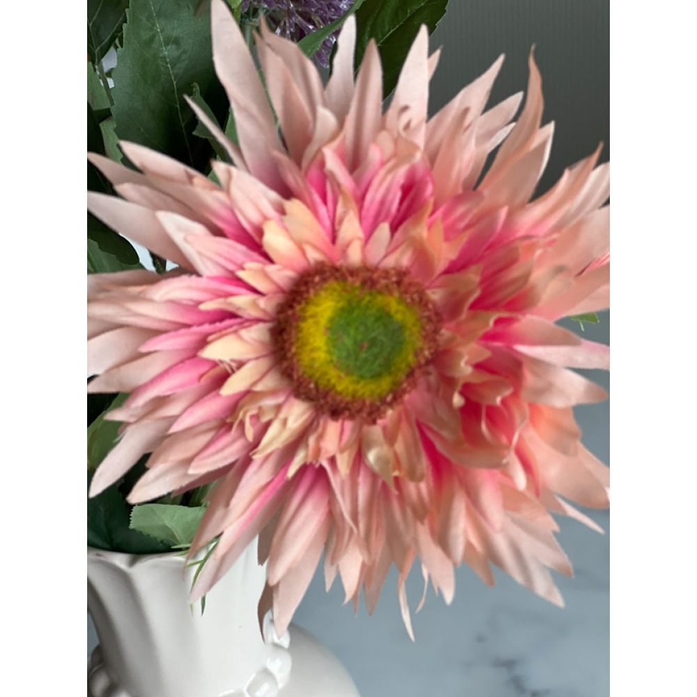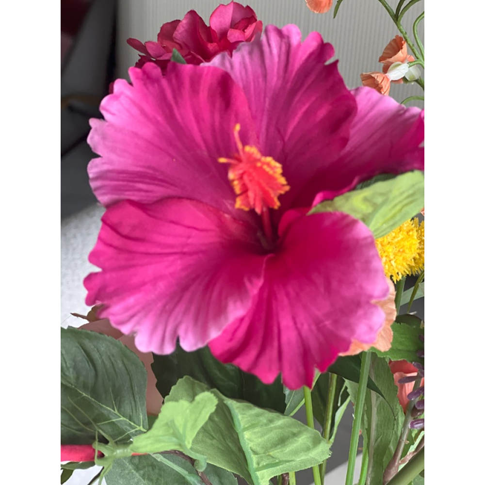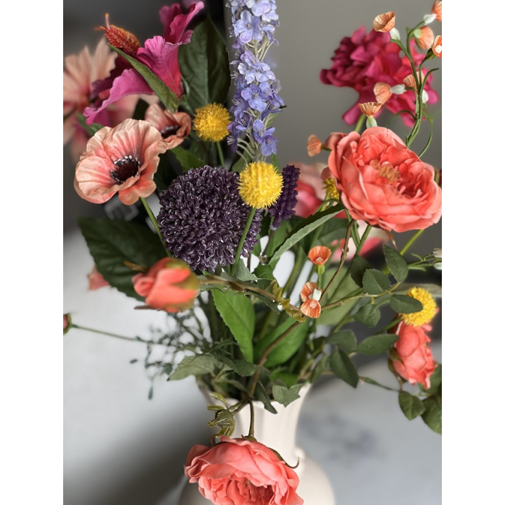 In het boeket zit: Tros Rozen, Gerbera, Ranonkel, Veronica, Roos, Cosmos, Hibiscus,