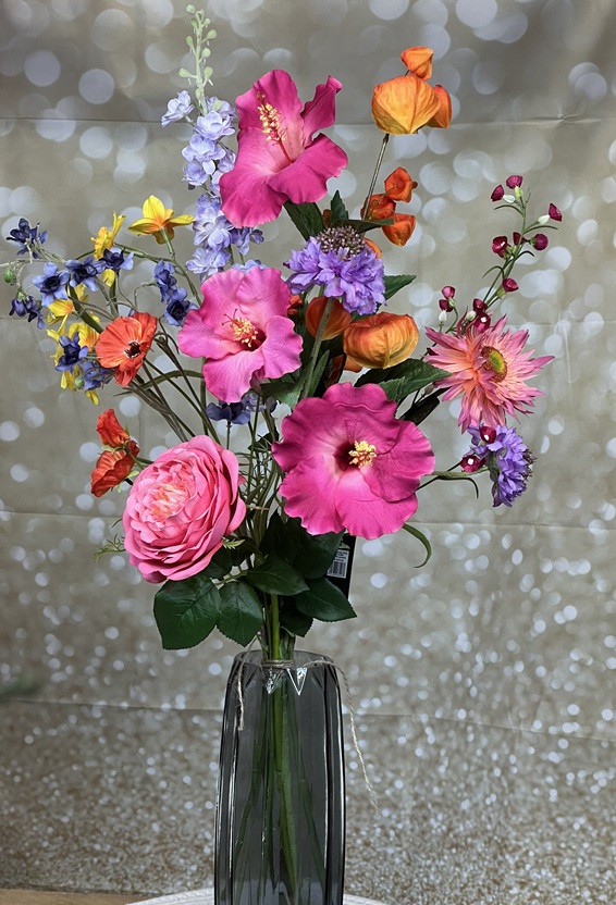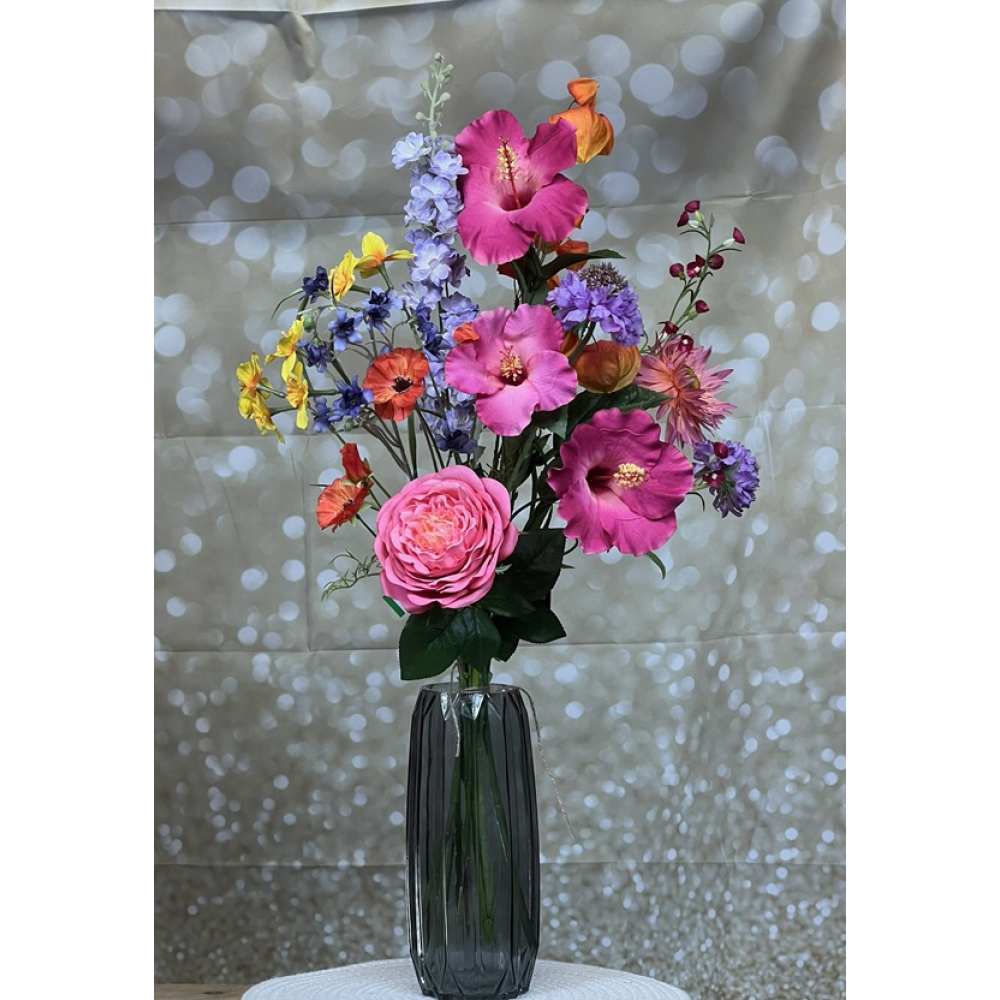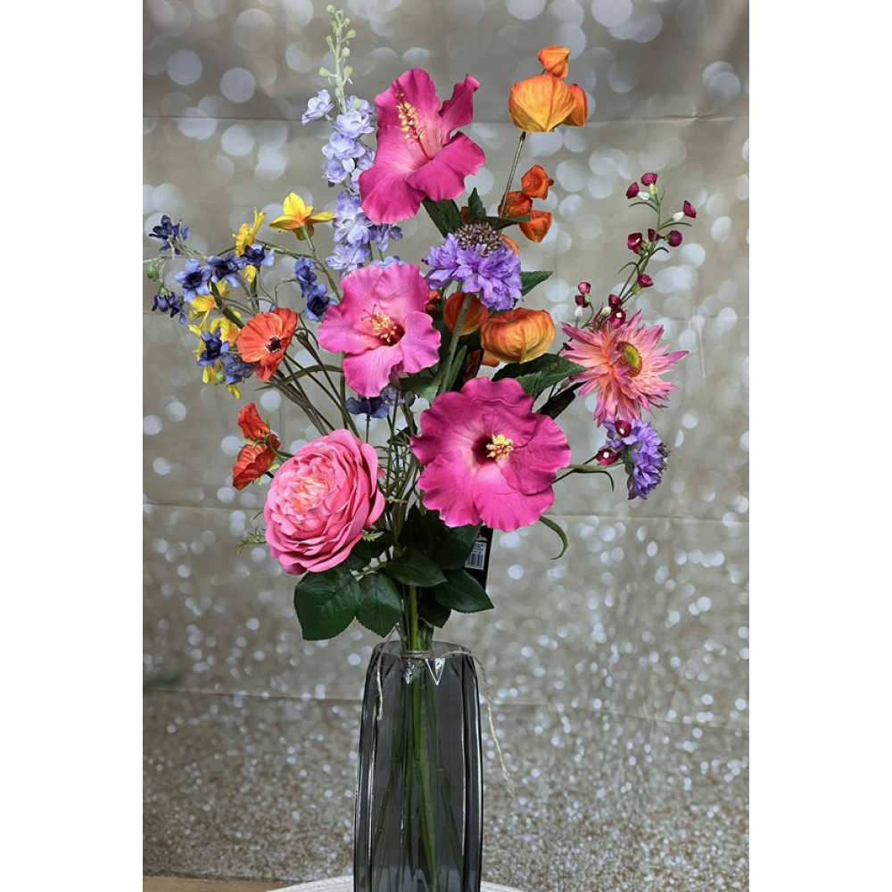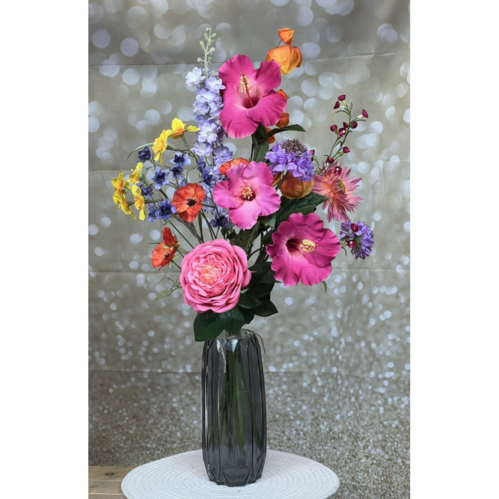 In het boeket zit: Narcissen, Roos, Ridderspoor, Hibiscus, Lampiontak, Nocotiana,