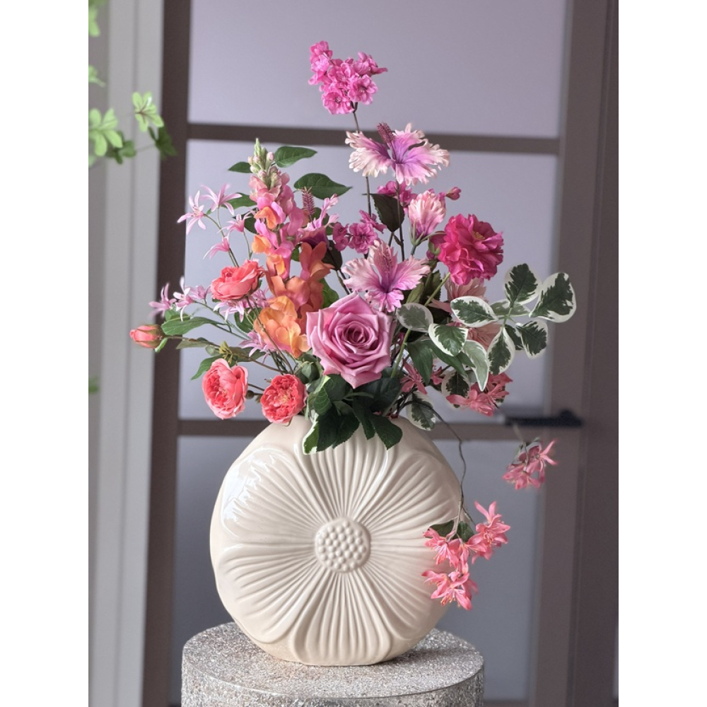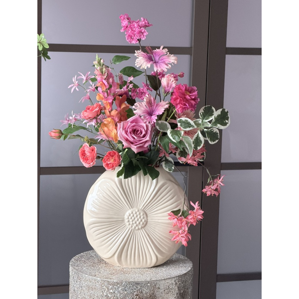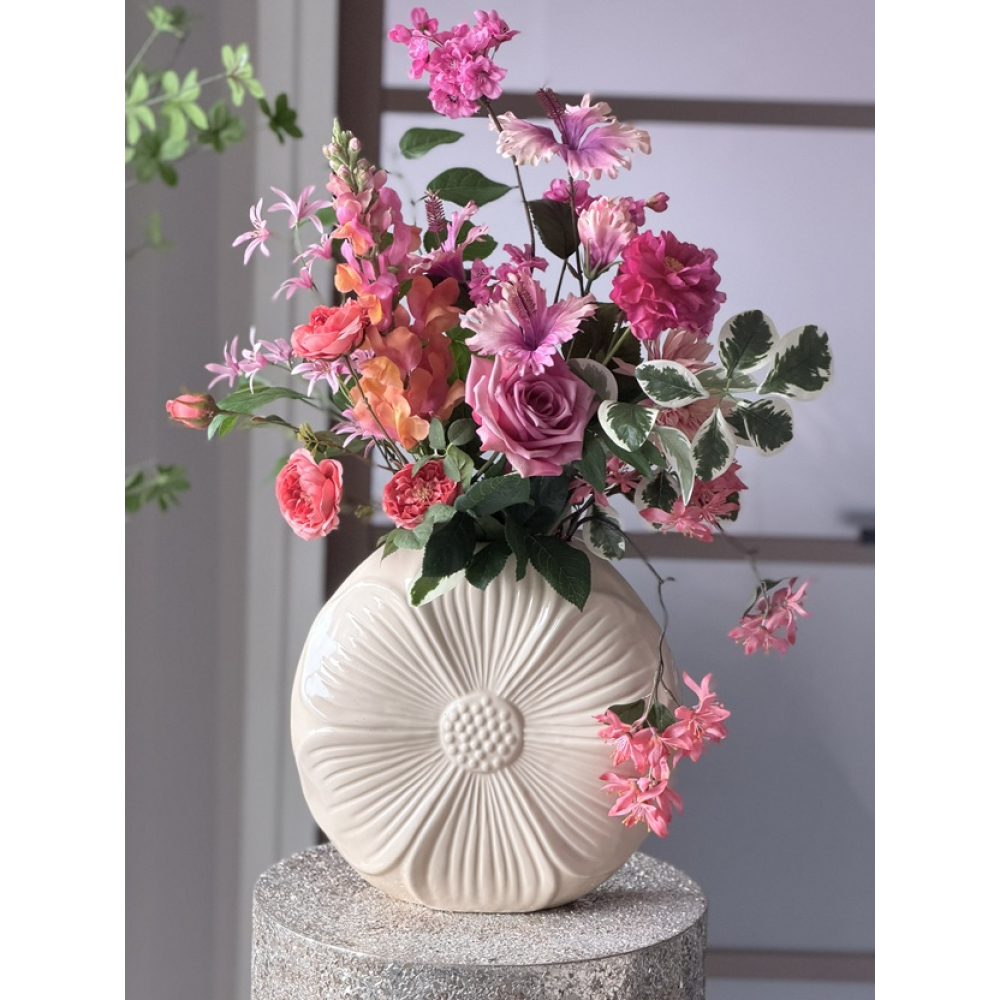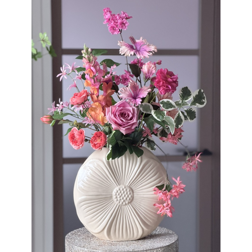 Zijden boeket in Daisy vaas is ongeveer 70cm hoog.