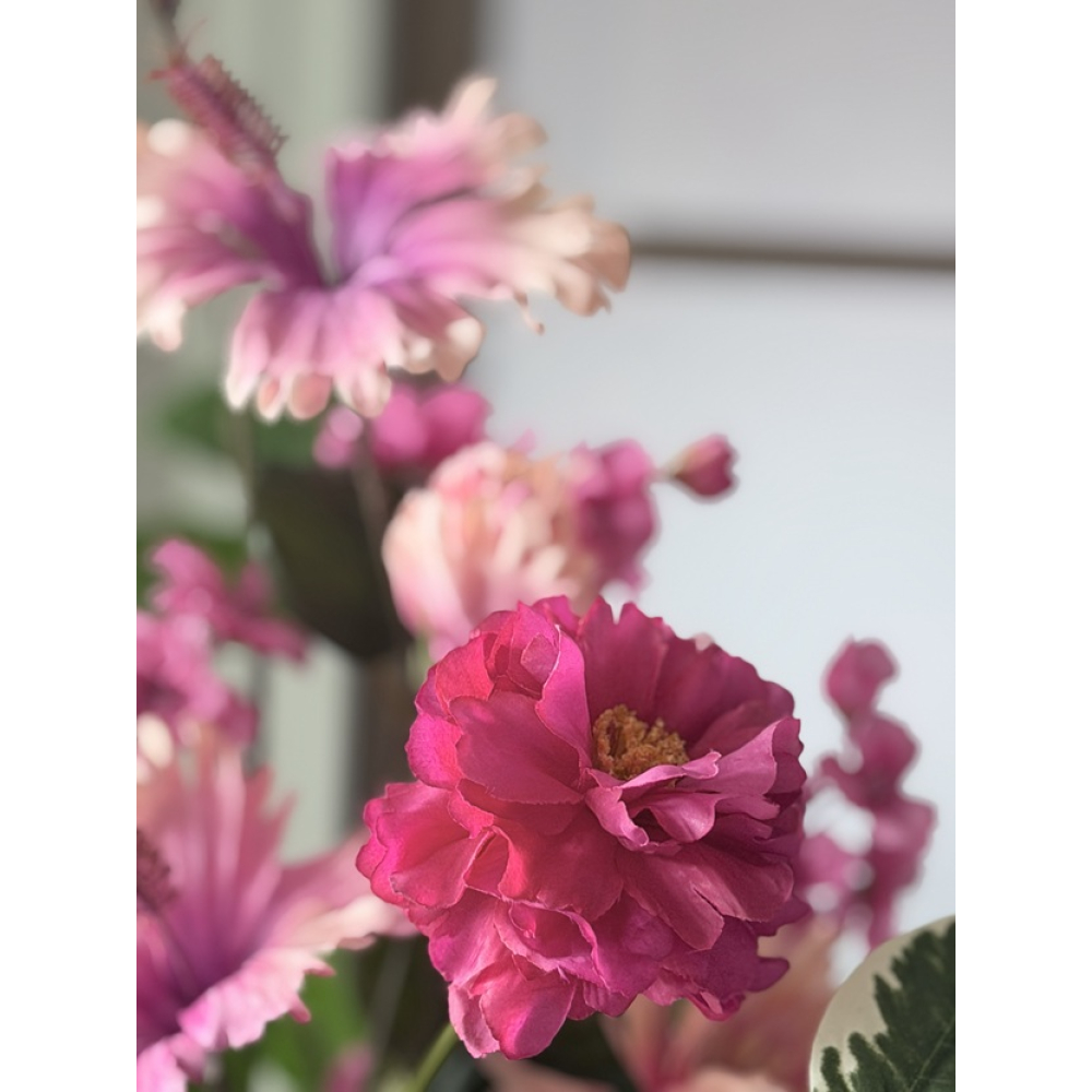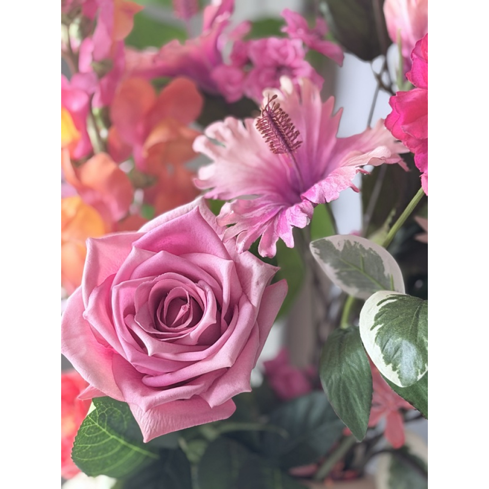 In het boeket zit: Roos, Ranonkel, Tros Rozen, Bloesem tak, Hibiscus tak,