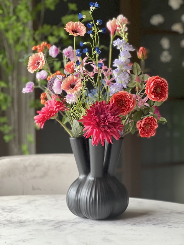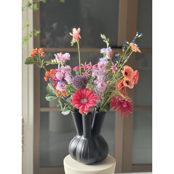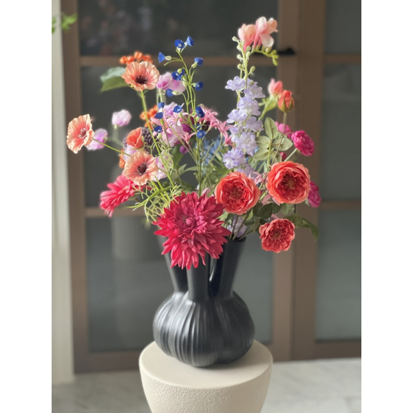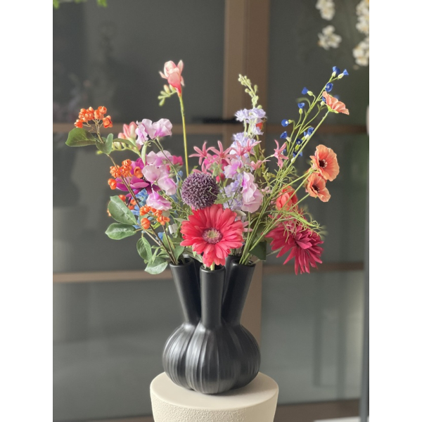 Zijden boeket inclusief tuit vaas is ongeveer 60cm hoog.