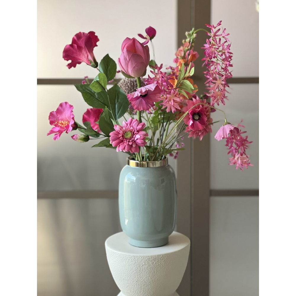 De vaas is van metaal en heeft een zachte oud groene kleur.