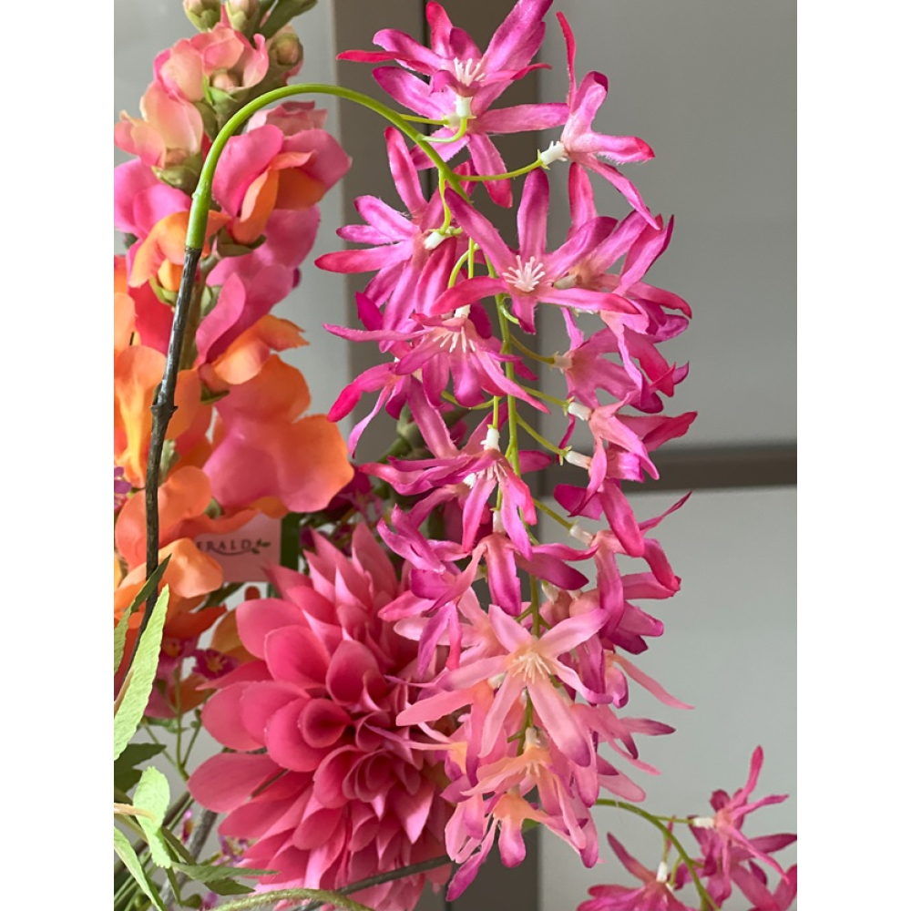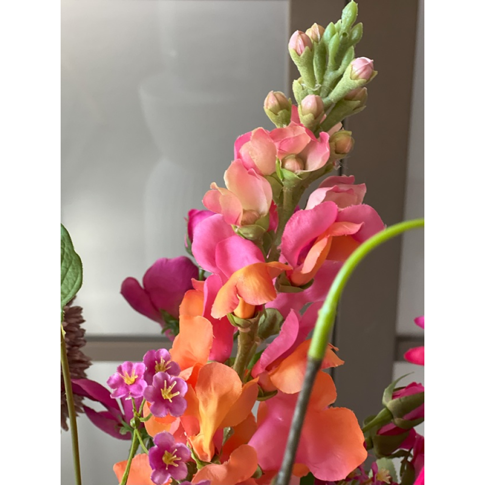 In het boeket zit: Lotus, Gipskruid, Uienbol, Hybiscus tak, Leeuwenbek,