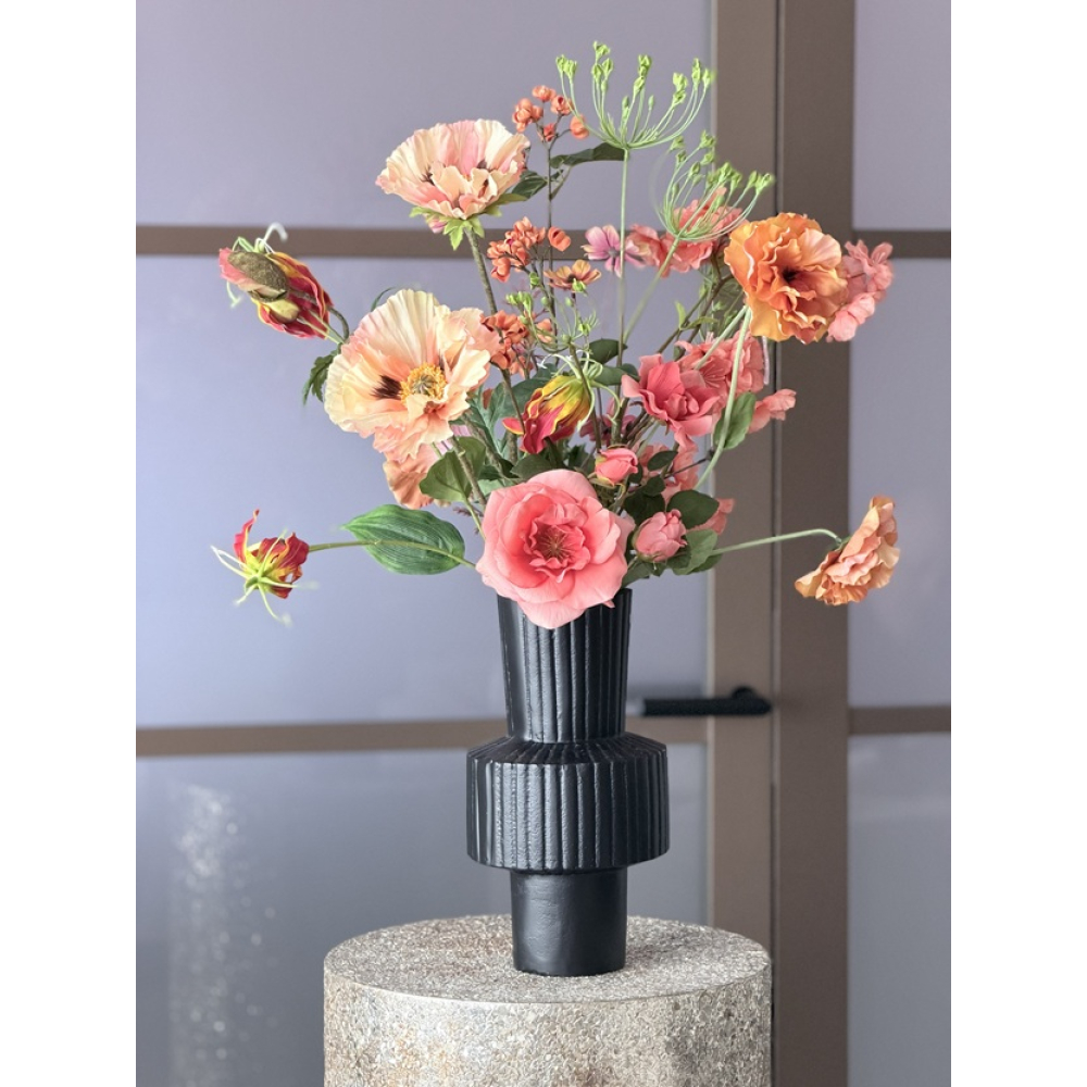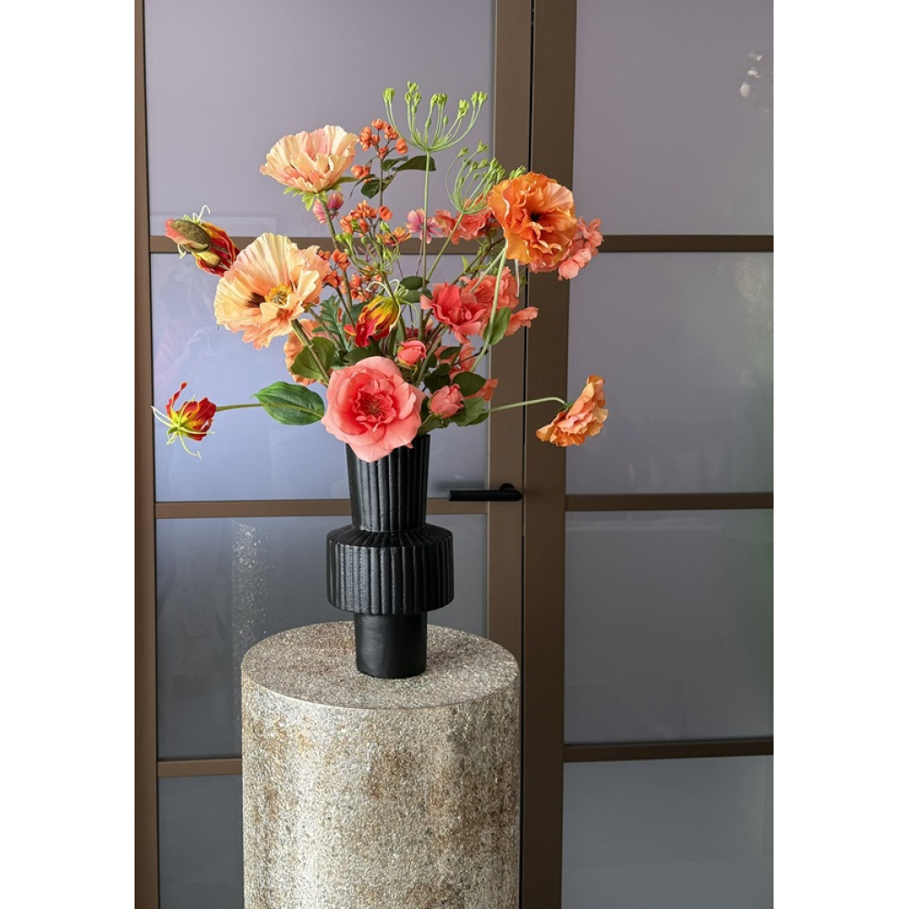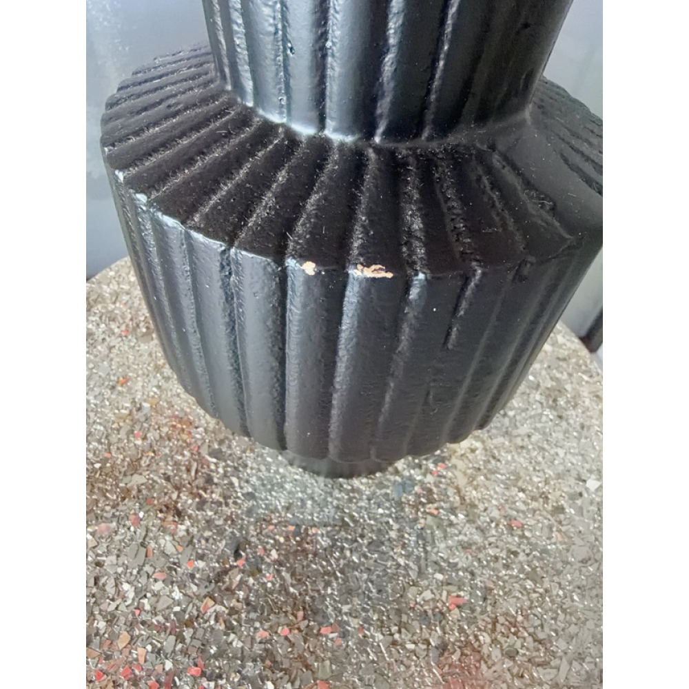 De vaas is van zwaar metaal in de kleur zwart.