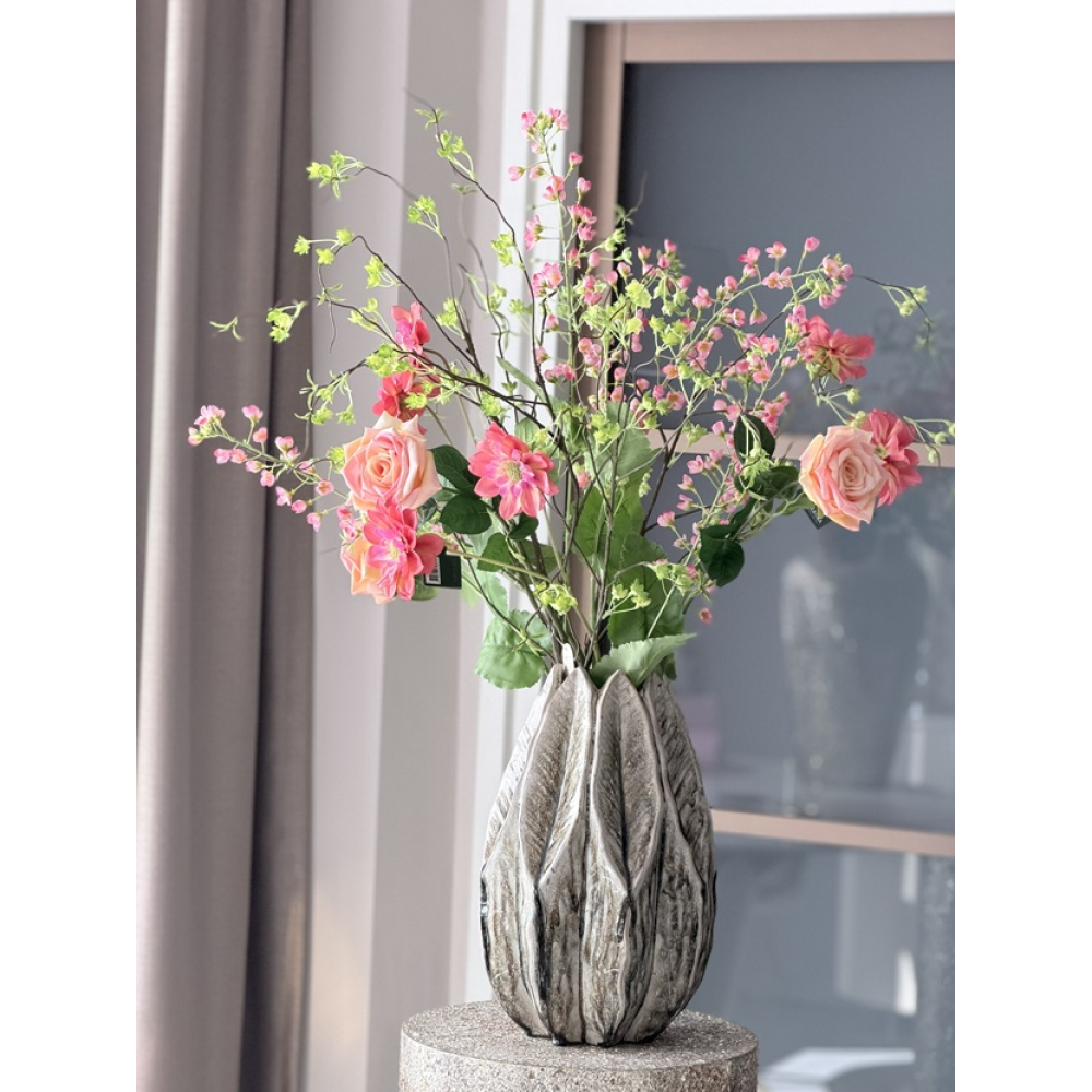 De vaas heeft een afmeting van D. 24cm en H. 40cm zonder bloemen.