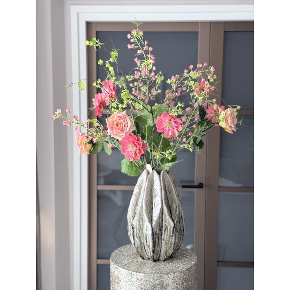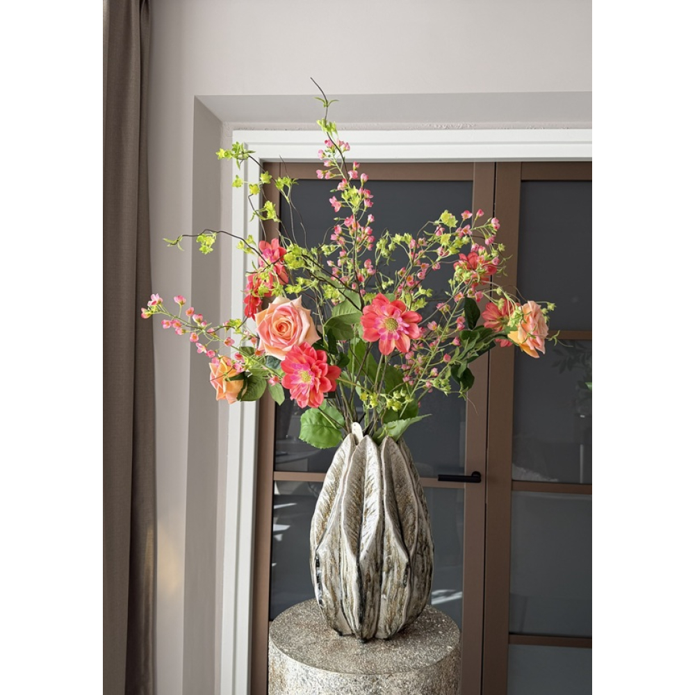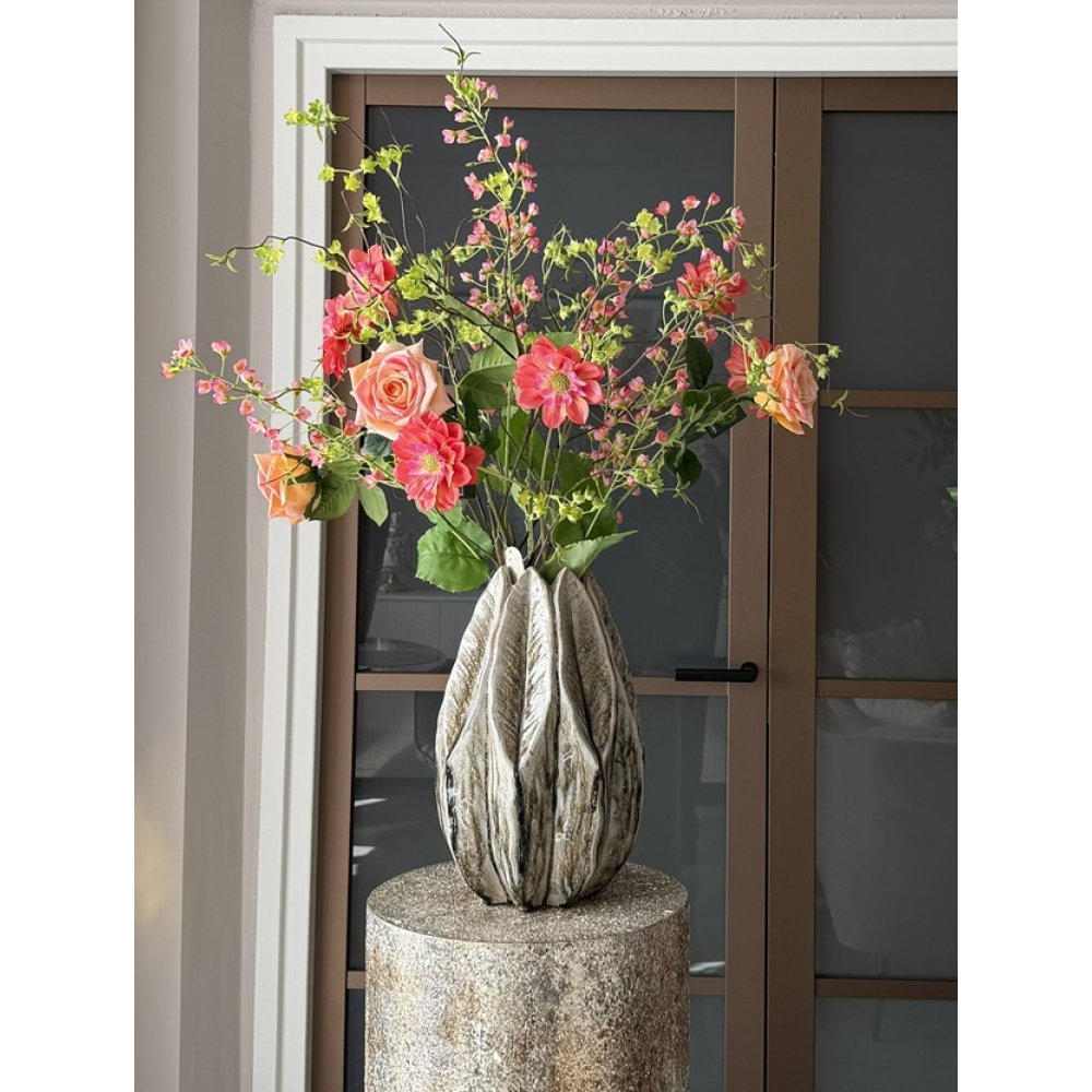 Aardewerk vaas Olive/Leaves. De hoogte met het boeket erin is ongeveer 100cm.