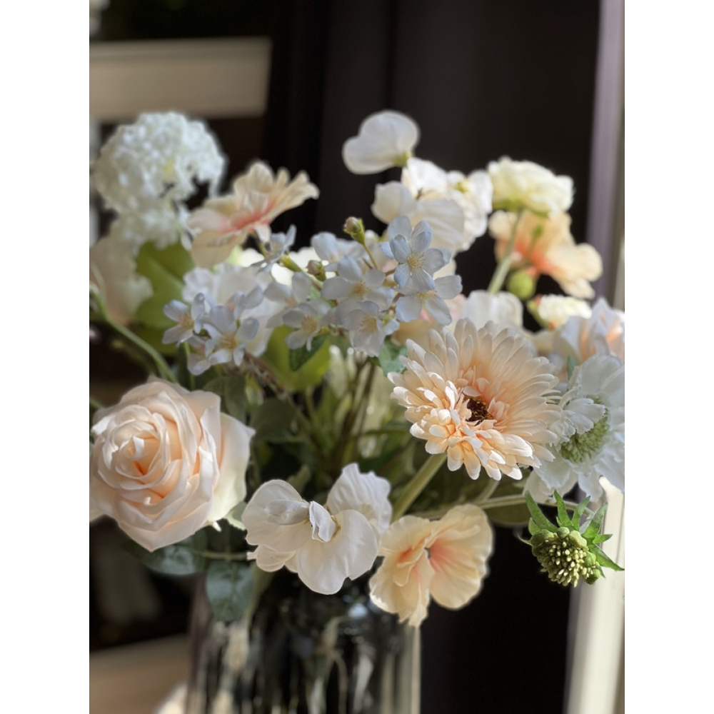 In het boeket zit: Rozen, Lathyrus, Scabiosa, Lysianthus, Cosmos, Dahlia,