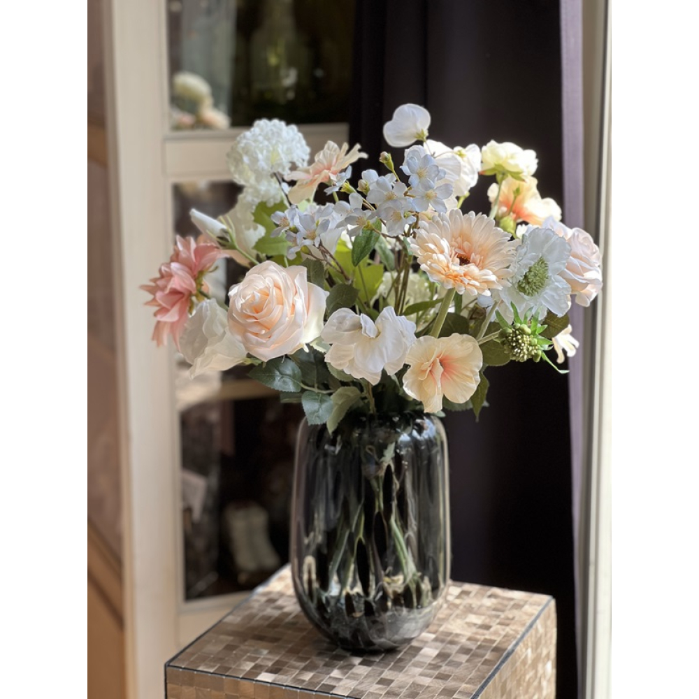 Zijden boeket zomer briesje is inclusief vaas ongeveer 50cm hoog.