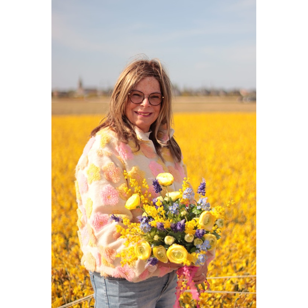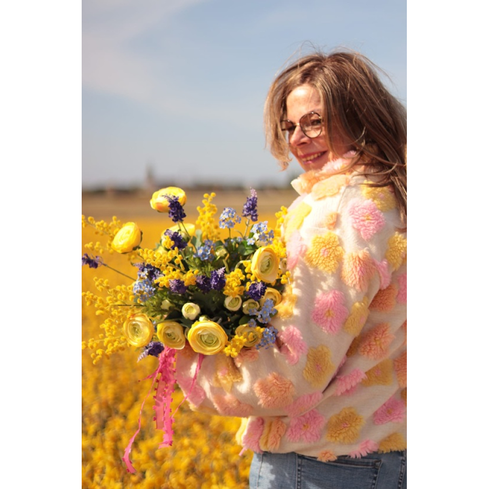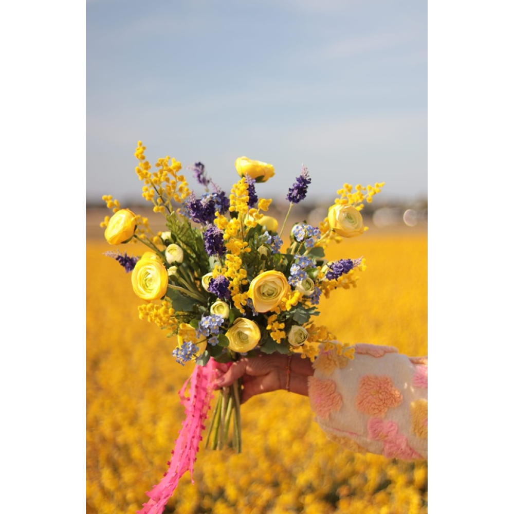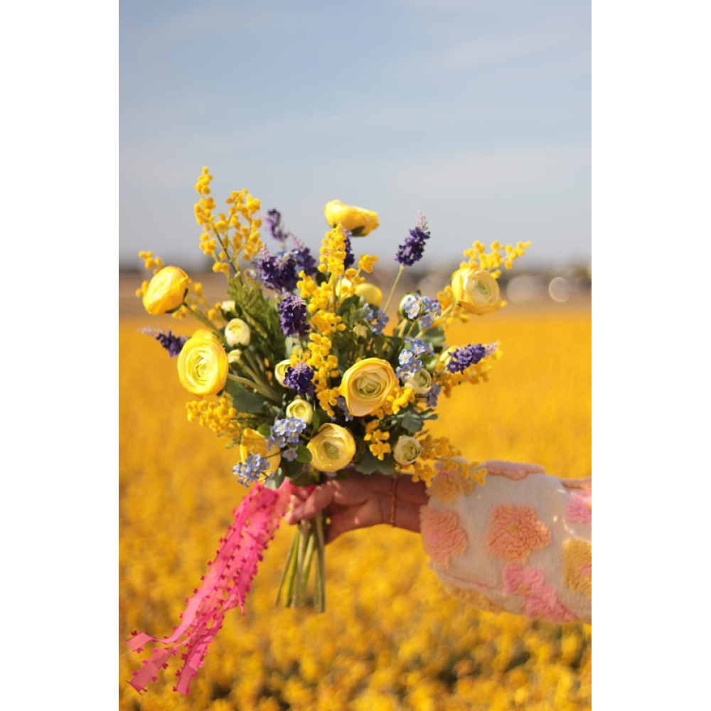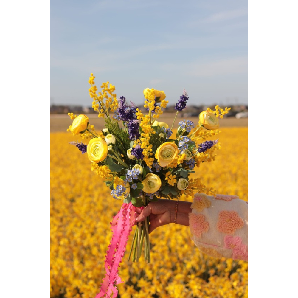 In het boeket zitten Ranonkels, Lavendel, Mimosa en Vergeet-mij-nietjes.