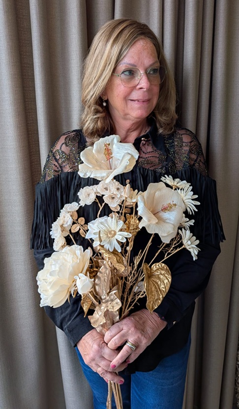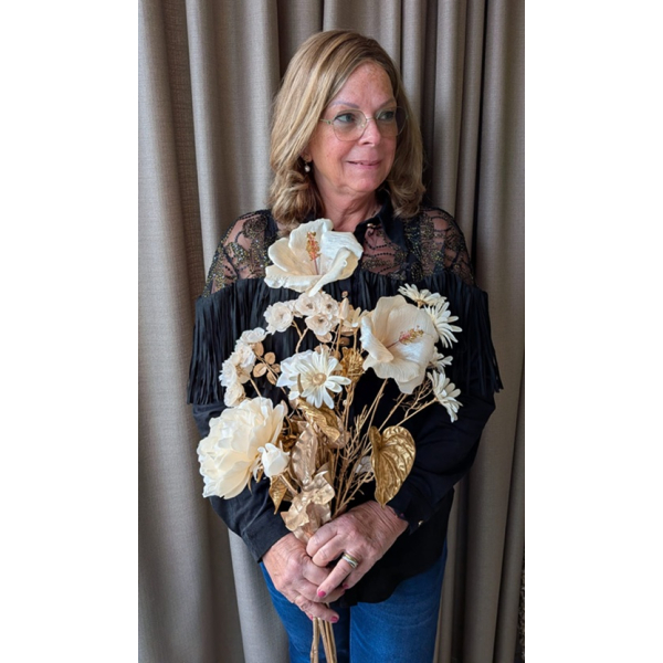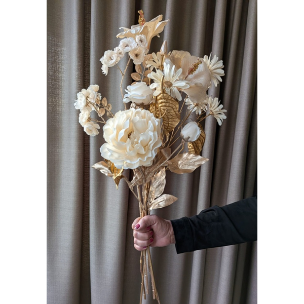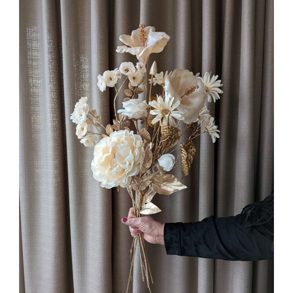 De bloemen zijn creme kleurig en de stelen en bladeren goudkleurig.