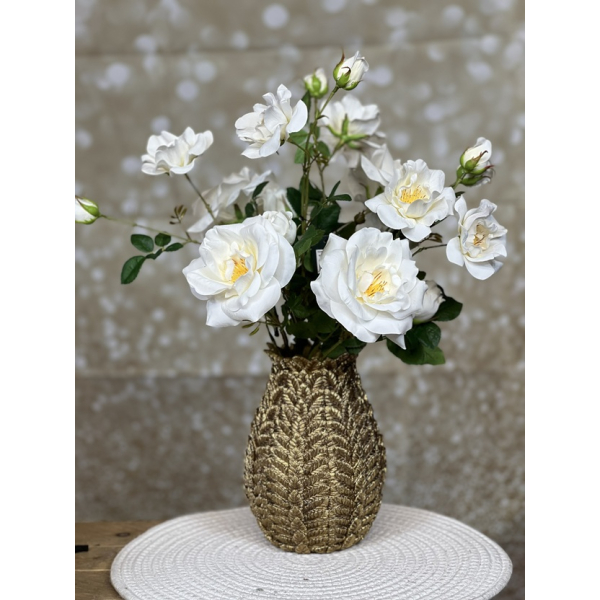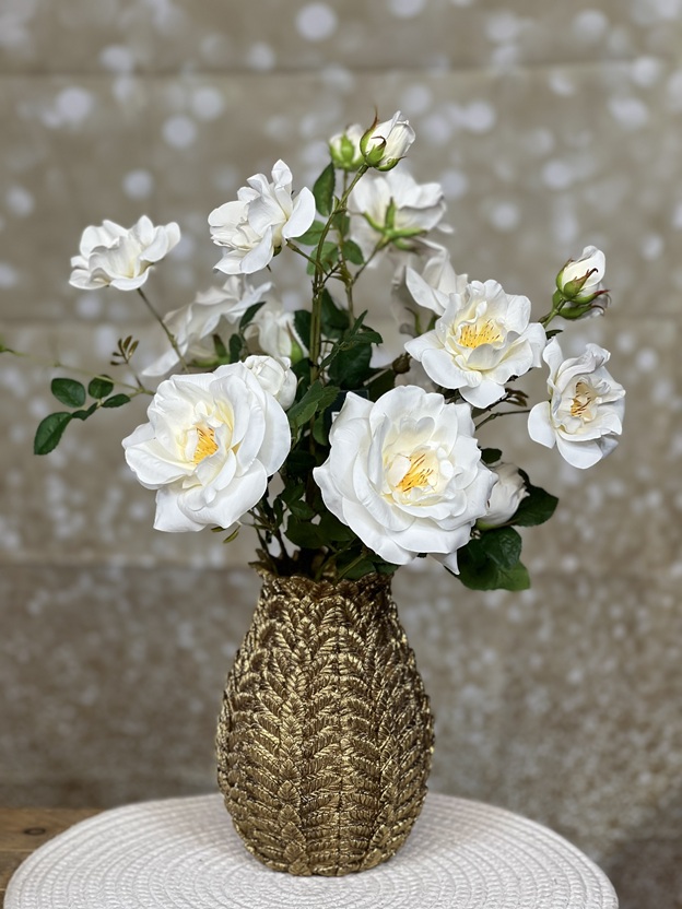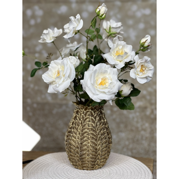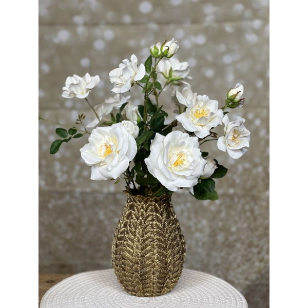 De vaas is goudkleurig. In de vaas zitten 5 takken met tros Rozen in creme/wit.
